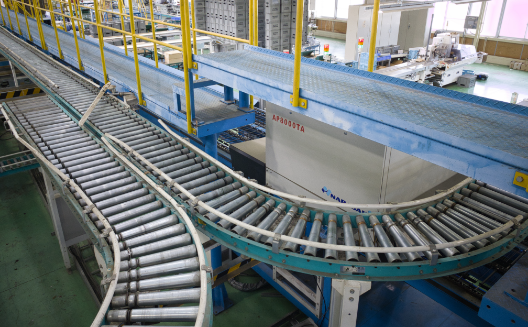 1本のコンベアで、水平→傾斜→水平の角度調整が可能です。これにより、従来のコンベアと比べて、専有面積や機長を大幅に削減でき、狭い場所でも効率的に搬送が行えます。